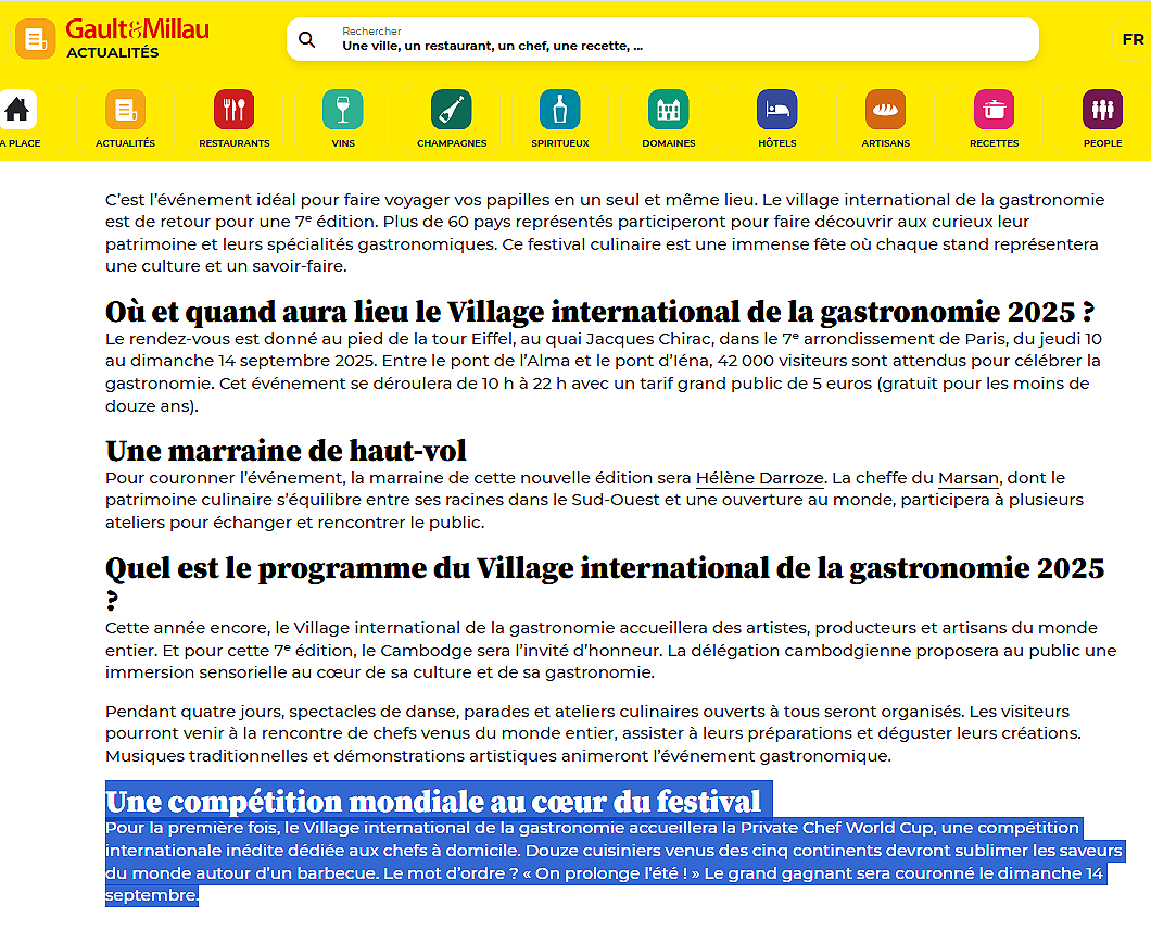 Gault & Millau du 29/07/2025 Les Chuchotis du lundi par Gilles Pudlowski du 18/08/2025 Time Out du 14 /08/2025 DP Village Internantional de la Gastronomie Stay Happening L’encre et les mots #59 du 6/07/2025 All events