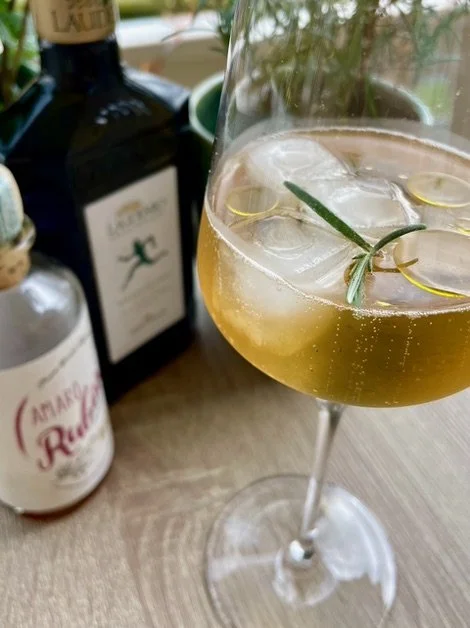 Amaro Rubino bio, Prosecco bio, glaçons, romarin, 2 gouttes d'huile d’olive Laudemio