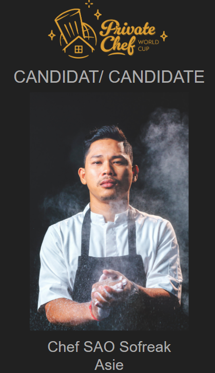 Ce chef privé est Cambodgien et vient spécialement pour l’évènement. Reconnu dans son pays, il organise des dîners prestigieux à chacun de ses déplacements. Chef autodidacte, il a travaillé avec des cuisines occidentale et khmère et est vice-président de l'Association des chefs cambodgiens (CCA), membre du comité de cuisine de la CRA et membre du TGFT (Groupe de travail sur la gastronomie).